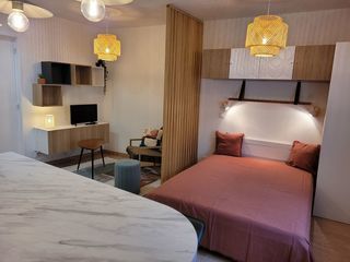Studio RdC avec cuisine ouverte équipée, plaques électriques, four, micro-ondes, frigidaire, hotte, grille-pain, cafetière, bouilloire. Coin salon avec TV. Coin chambre avec lit 14
