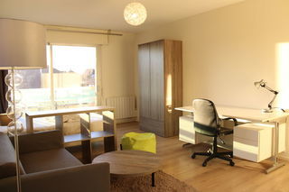 Belle et grande chambre meublée (lit 140*190, chevet, rangement, canapé, table basse, bureau, frigo, table et chaises) d'une surface privative de 22 m² avec deux balcons privatifs