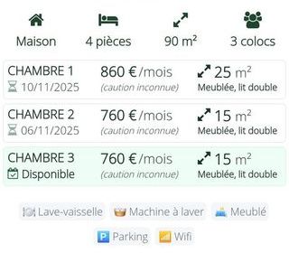 Je cherche à créer une colocation sympa dans une maison neuve avec piscine,wifi ,clim etc etc .. Seulement 499€ par personne Dix minutes des champs Elysées Dix minutes du chât