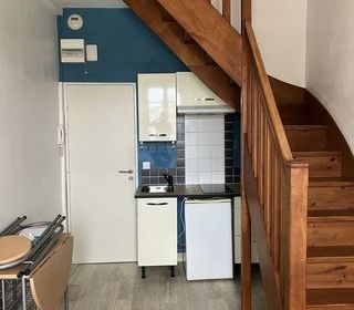 Duplex de 25 m² meublé au premier étage avec interphone offrant : une cuisine aménagée (table et 2 tabourets) et équipée (réfrigérateur, plaque induction, hotte, micro-onde), un
