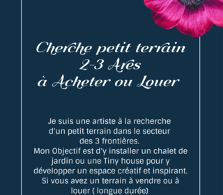 Je suis une artiste (peintre, écrivaine, compositrice, musicienne) à la recherche d'un petit terrain de 2 à 3 ares dans le secteur des 3 frontières. Mon objectif est d'y installe