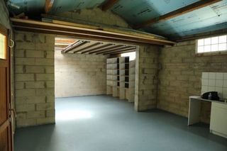 Entrepôt en fond de jardin de 41m2 en une seule pièce de 8,50 mètres sur 4,90 mètres et d'une hauteur maximum de 2,75 mètres, avec une porte de 2 mètres de large et une porte de 1