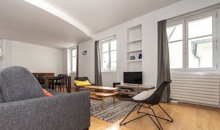 Appartement meublé au 3em étage avec 1 grand-lit (140 cm), TV (écran plat), chaîne stéréo, DVD et volet roulant électrique. Cuisine ouverte (2 plaques de cuisson, four, lave-vaiss