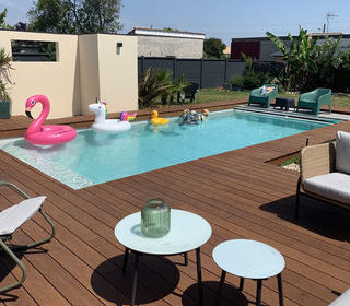 Maison de 55 m2 avec terrasse privée sur parcelle avec maison principale. Salon cuisine équipée module climatisation ; deux chambres avec lit double, commode, bureau et TV dans ch