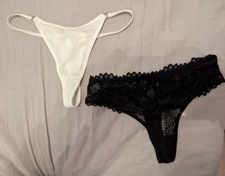1 string blanc super sexy avec petits coeurs et un tanga noir super agréable à porter N'hésitez pas à me contacter pour toutes demandes. Vente en lot ou à l'unité