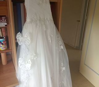 magnifique robe de cérémonie taille 12ans couleur écru dentelle petit noeud sur le devant , bretelle brodée