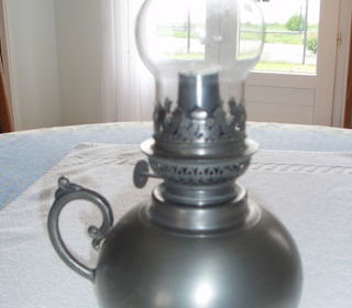 Lampe à pétrole en métal avec réservoir sphérique, anse latérale et cheminée en verre. L'objet est en bon état apparent, sans décoration visible.avec mèche fonctionnel
