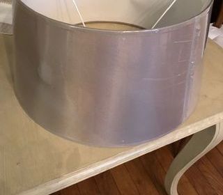 Abat-jour de forme cylindrique, de couleur grise, avec intérieur blanc. L'objet est présenté posé sur une table, sous film plastique de protection. il y a plusieurs couleurs et pl
