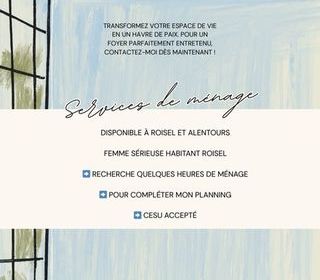 Bonjour Je suis femme de ménage depuis 2023 Il me reste des disponibilités Je travaille actuellement chez des particuliers en CÉSU et pour une entreprise déca propreté ou je fa