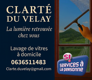 Bonjour! Entreprise sous le nom de Clarté du Velay, j'interviens en tant que laveur de vitres sur le secteur du Puy en Velay et ses alentours, pour particuliers et profesionnels