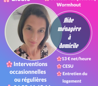 Bonjour, Je m'appelle Élodie, j'ai 38 ans. Je suis d'Esquelbecq. Aujourd'hui, je propose mes services pour: Ménage et entretien complet du logement (sols, vitres, sanitai