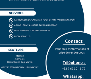 Bonjour auto entreprise Pro Clean spécialisée dans l'entretien des Airbnb ainsi que les check-in, également laboratoire, centre médical sur les secteurs de Menton, Carnoles et Roqu