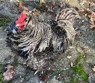 Deux coqs nés en mai 2025. d'un coq nain Houdan et d'une poule soie frisée grande taille et le deuxième coq né du même coq Houdan avec une poule Batham de Pékin mille fleurs nain