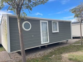 mobil home en tres bon etat. Tres Propre. Salon central. 2 chambres. 6 couchages. Bardage vinyle bi ton. Beige et gris design moderne Cuisine équipée. WC séparé. Disponible.