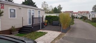 Mobil home Anglais Panoramique 2 chambres Séjour avec beaucoup de clarté Cuisine toute équipée Table et chaises Salle de bain Prises européennes Possibilité d'y vivre à l'