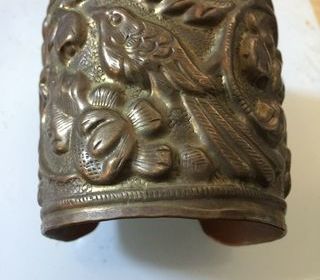 Magnifique bracelet manchette ancien en métal doré (laiton) travaillé en relief. Décor animalier et floral très détaillé représentant des oiseaux parmi des fleurs et des feuill