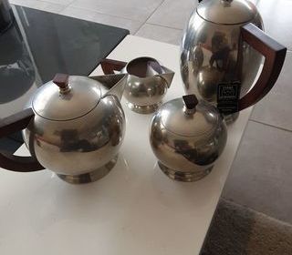 Très beau service à thé ou autres.,véritable étain du manoir,très design, manche en acajou massif,4 pièces jamais servis,tout neuf.