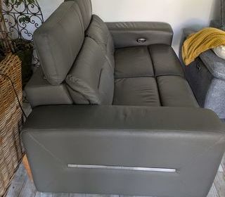Canapé relax électrique deux places en simili cuir gris foncé. Fonctionne parfaitement. Des petites imperfections en photos mais qui restent discrètes et ne gachent pas l aspect g