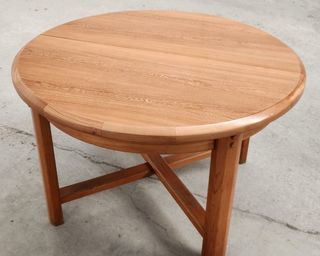 Table ronde en orme massif français en bon état (quelques traces d'usure) 120 cm de diamètre + 1 rallonge centrale de 42 cm pour une de longueur totale de 162 cm Hauteur platea