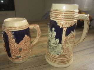 vends 2 chopes à bière vintage,de 70 cl et 1 litre, avec un joli décor en surimpression, en parfait état, pour décoration, au prix de 15 euros le lot -