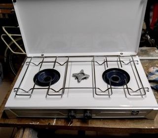 Réchaud à gaz blanc avec deux brûleurs, équipé d'un couvercle rabattable émaillé facile pour l'entretien . Marque Camping-gaz Support trépied pour bouteille 907 fixation direct s