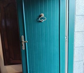 Suite transformation porte entrée bois massif sans bâti. 0,94m x 2,06m l'extérieure peint couleur RAL6005 Intérieur blanc cassé avec moulure déco. Vendu sans heurtoir sans po