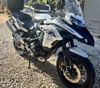 Benelli TRK 502 X 2022, blanc et noir. Moteur : Bicylindre en ligne, 4 temps, refroidissement liquide, 4 soupapes par cylindre et double arbre à cames en tête Puissance : 35 kW