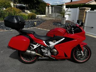 VFR800F avec bagageries Honda 2014 Double des clés Pot Akrapovic titane Rehausses de guidon valises Honda avec clé unique entre moto et bagages top case Honda avec clé unique entre