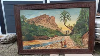 tableau ancien issu d;un héritage représente un paysage marocain peint sur toile ,avec cadre bois ciselé . dimensions : 149 cm part 99 cm