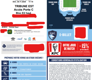 50€ les deux cote à cote HAC - LOSC Paiement en espèces pour une remise en main propre sur teteghem ou paypal pour un envoi ici ou par mail.