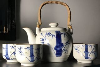 Service à thé en grès décoré de motifs bleus et blancs représentant des bambous. Matière : Grès Couleur / Motif : Blanc avec décor bleu de bambous État neuf N'hésitez pas à c