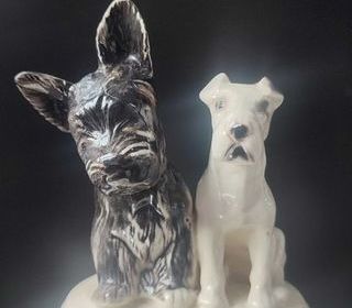 Poudrier ancien en céramique craquelée, marqué et numéroté €oeGermany". Le couvercle est décoré d'un Scottish Terrier et d'un Fox Terrier, modèles typiques des productions alleman