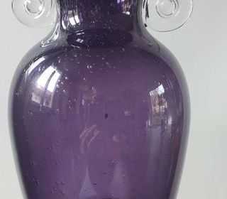 Vase italien vintage en verre d'art bullé violet améthyste. Soufflé à la bouche , avec anses en spirale transparentes stylisées . Bulles présentes dans toute la surface. Très bo