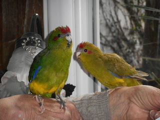 Vends perruches kakarikis élevés à la main, âgés de 3 mois 1 bleu, 1 jaune, 2 panachés vert et jaune prix : 70 € l' une