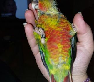petite conure pyrrhura molinae née le 1er octobre 2025, élevée à la main par mes soins suite à l'abandon de ses parents. Très attachante, joyeuse et joueuse, elle aime énormément l