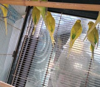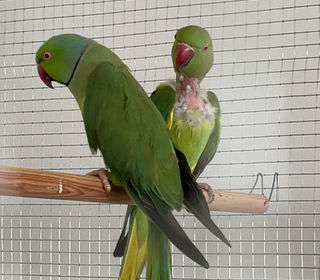 Couple perruche à collier verte âge 6 ans La femelle n'as plus de plume au coup suite a la reproduction avec le mal