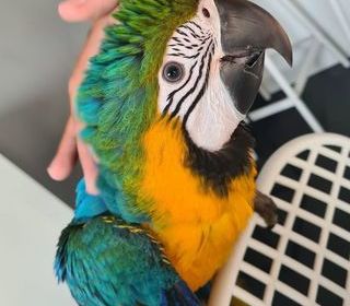 Bébé Ara Ararauna totalement élevé à la main, jeunes de 2025 actuellement en cours de sevrage, bague fermée 2025, tests maladies OK, tous documents à jour. Ils me restent deux fem