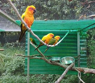 A céder, 3 conures soleil, 2mâles et 1femelle, aratinga soltitialis. oiseaux élevés par les parents en volière extérieure. Ils sont bagués 2025 et sexés par ADN