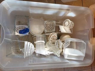 3 cages de reproduction pour petit oiseaux. Tout un lot accessoires, mangeoires, nids et autres.