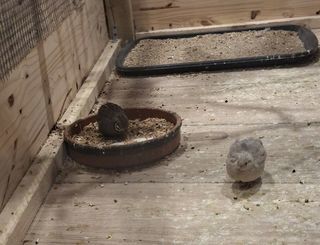 Couple de caille chine, né en 2025. Femelle grise perlée et mâle foncé avec collier blanc.