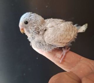 Vends perruche ondulée de trois semaines pour élever à la main ou attendre le sevrage et dans ce cas nourrie par les parents Père tout blanc aux yeux noirs Mère bleue panachée
