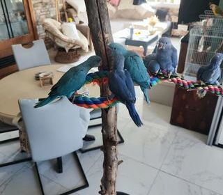 Lot de 20 Conures Pyrrhura avec leurs cages artisanales en bois de 2 /1 mètre et 3 autres cages en fer et plastique et des petites cages de transport Différentes couleurs bleu ,