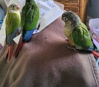 Jeunes conures femelles elevees main nees fin fevrier 2026, deux sont vertes, une est cinamon, couleur amande, partiront avec leur certificat de sexage et leur certificat de cessio