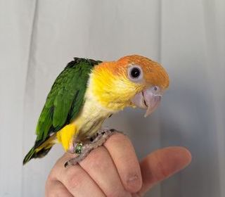 Bonjour, caïque en cours de nourrissage. Baguée 2026 Sevrée d'ici 1 mois Il est sexer adn c'est un mâle Il est super câlin et adore le contact humain. Habitée au fruit légume.