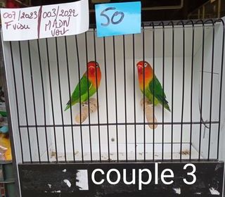 Un mâle , une femelle perruche tête prune porteurs diluées de 2024 . 4 males tête prune porteurs dilués de 2025 , tous sexés ADN . Issus de père dilué (photo) et de mère porteuse d