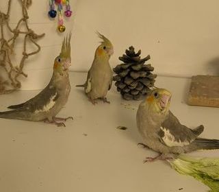 Calopsittes eam (élevé à la main) Âgées de 2 mois et demi Il y en a 3 (voir photo 1), elles sont de la même fratrie et sont identiques en tout point (taille, couleur...) Trop j