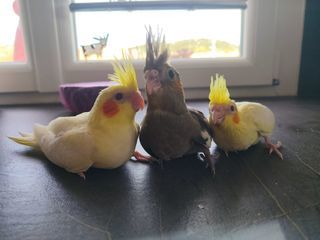 Calopsitte élève a la main, sexage adn, les trois sont des femelles et bagué. Manipulé aux quotidien par adulte et enfant de 6 ans. Disponible aux alentours du 17-24 avril. Peut