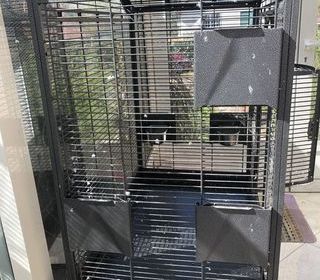 Cage avec table roulante et étagère Hauteur totale 140 cm Dimensions de la cage hauteur 80 cm longueur 70 profondeur 45 cm Description 1 grande porte en façade 1 petite porte
