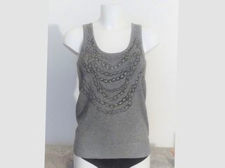 Top/ Tee Shirt Gris avec Strass sans manches- Taille Unique- Js Millenium * Top/ tee shirt gris clair avec un dessin de différentes tailles de sautoirs en strass et des pièces m