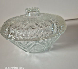 Grande bonbonnière sucrier drageoir en verre travaillé ronde évasée motifs de c?urs, roses et feuilles avec couvercle Vintage des années 1970 Maté